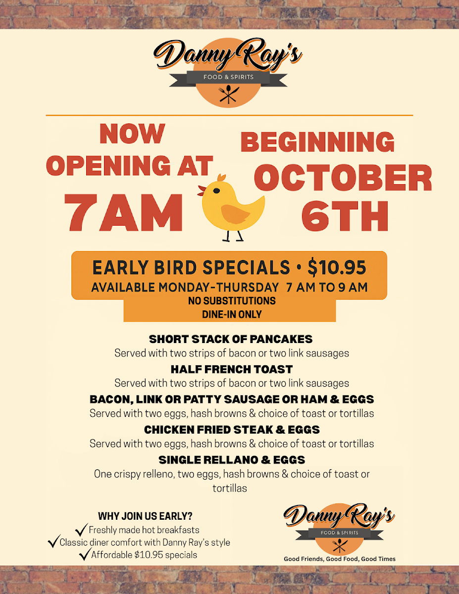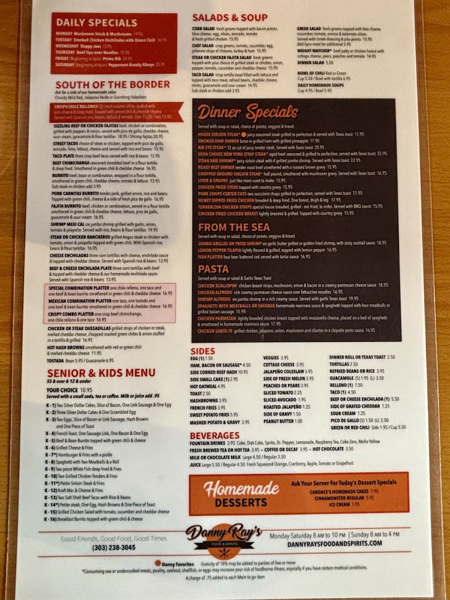 Danny Ray’s Food & Spirits offers a straightforward yet satisfying menu, blending classic diner fare with hearty Mexican-inspired dishes and comforting breakfast favorites. Whether you're stopping by for a morning meal, a casual lunch, or a relaxing evening at the bar, the menu provides a range of options designed to fit different times and moods throughout the day.